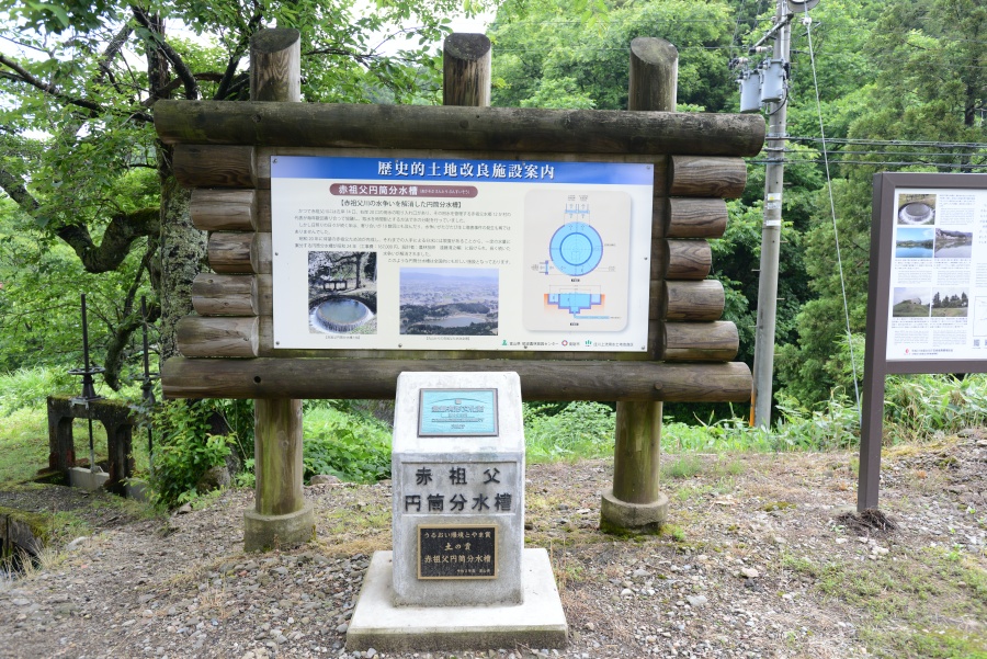 赤祖父溜池工事の一環として築かれた県内最古の円筒分水槽です。