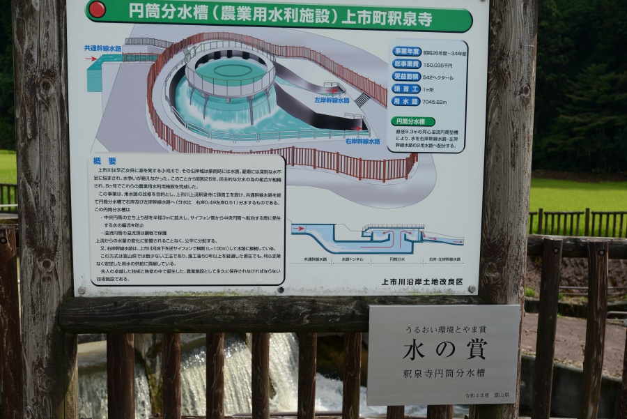 此処の分水槽も水量が多く迫力があります。写真で見ると水が二分割されているのがよくわかります。少し分かりづらい所にあるので上市町の資料にアクセスして見て下さい。