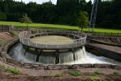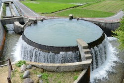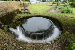 円筒分水槽とは、サイフォンの原理で円筒部中央から水が出る仕組みになっており、円筒部の外側に均等に水が流れ出て農業用水に供給されるようになっています。