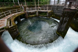 写真を見てわかると思いますが、円筒部の径は9.3mと大きく水量の多さも相まって近づくとゴーという轟音と共に大量の水が流れ出ており少し飛沫なども感じ、迫力を感じます